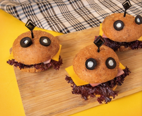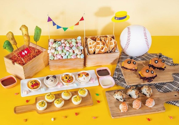 「百宴」自助餐廳主廚梁峰豪今年特別融合小朋友喜歡的食物以及均衡飲食的概念,推出多道繽紛兒童主題創意料理,包含了營養美味的日式三角飯糰、鮮蝦壽司球,深受小朋友喜愛的牛肉起司漢堡起司、火腿熱壓三明治、海苔熱狗,以及西方國家在復活節時必吃的「魔鬼蛋」。甜點還有多款卡通造型的杯子蛋糕,小老虎、麵包超人、天竺鼠等,超萌造型。