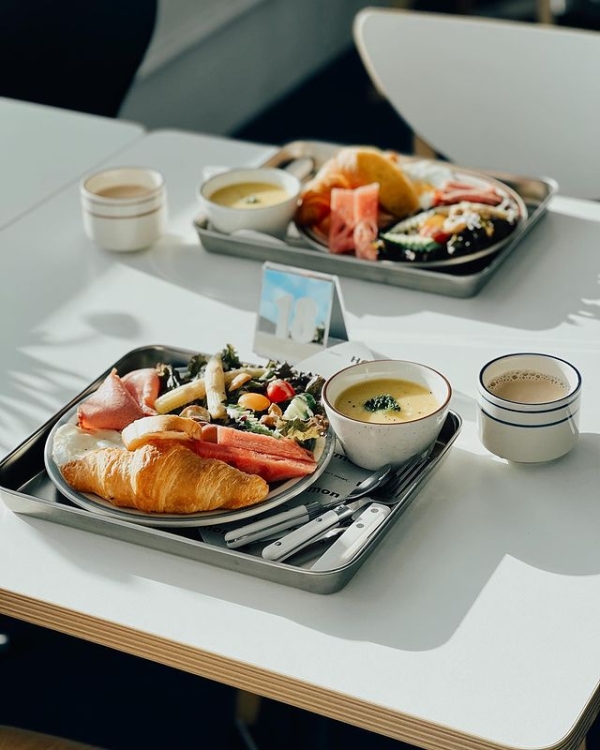 早餐採套餐制,前一日辦理入住時,櫃檯人員會詢問用餐時間以及是否有特殊飲食需求,用餐地點在民宿一樓大廳公共空間。早上8:00-10:00為早餐供應時段,可以悠閒的用餐之餘,順道感受窗外陽光的陳之光采。