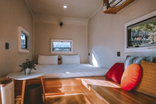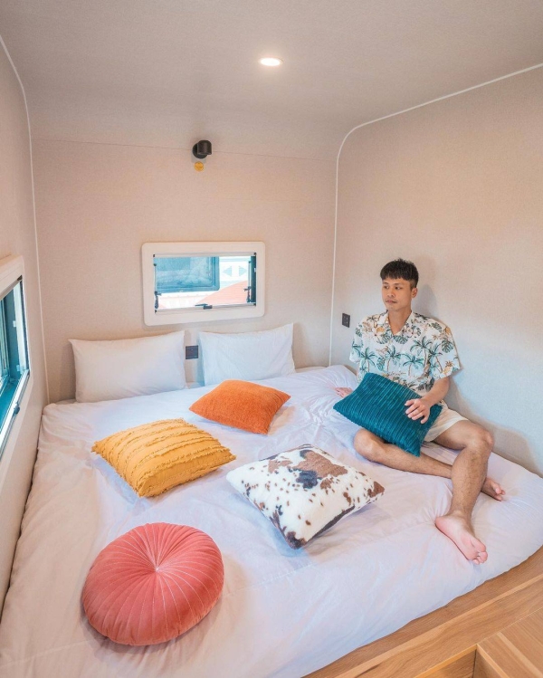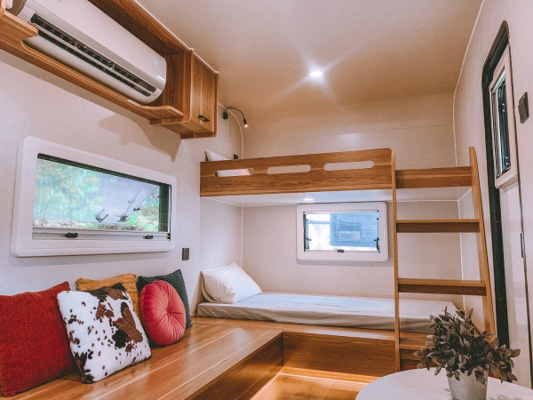 車內裡頭備有一張雙人床、兩張單人床上下舖及冷氣,可供四人家庭、好友共同入住。