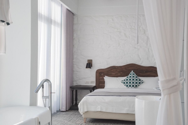 房內設計仿造石頭壁面,配上實目古董傢俱,營造出復古的感覺,以及舒適的沙發,讓一進房的旅客即能感到放鬆。