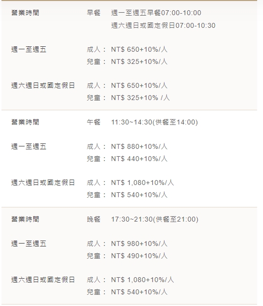 收費標準:平日午餐成人NT$880/位、孩童NT$440/位;平日晚餐成人NT$980/位、孩童NT$490/位;假日午/晚餐成人NT$1080/位、孩童NT$540/位,以上皆需另收10%服務費!