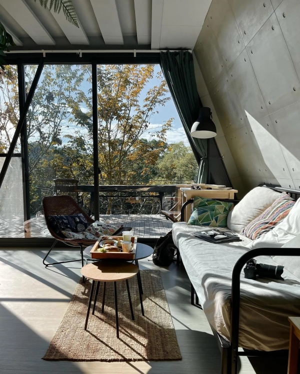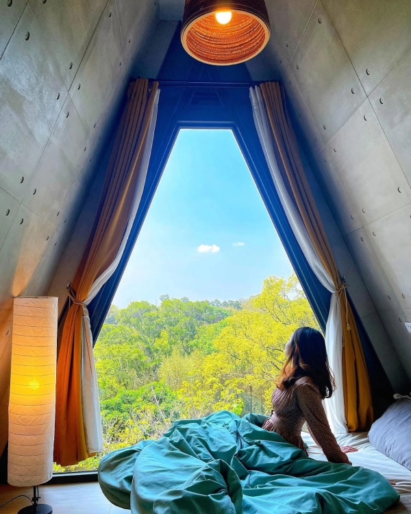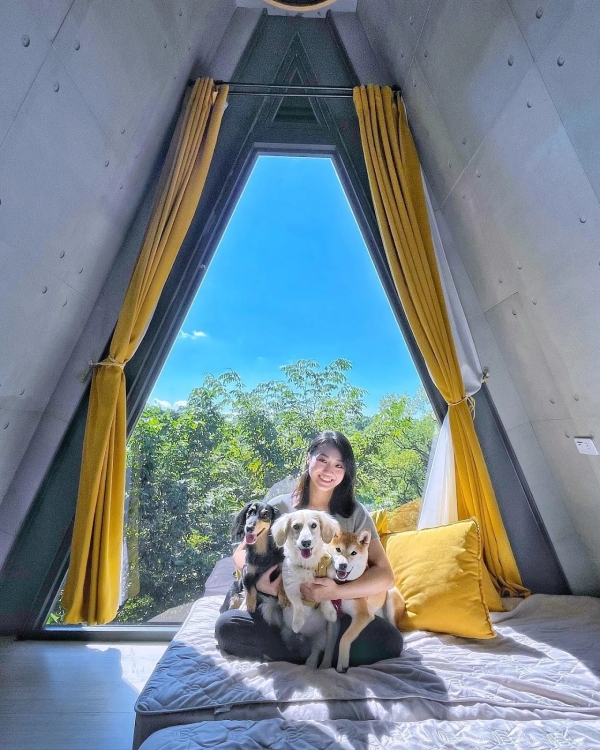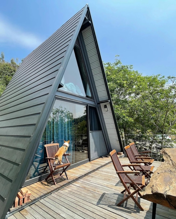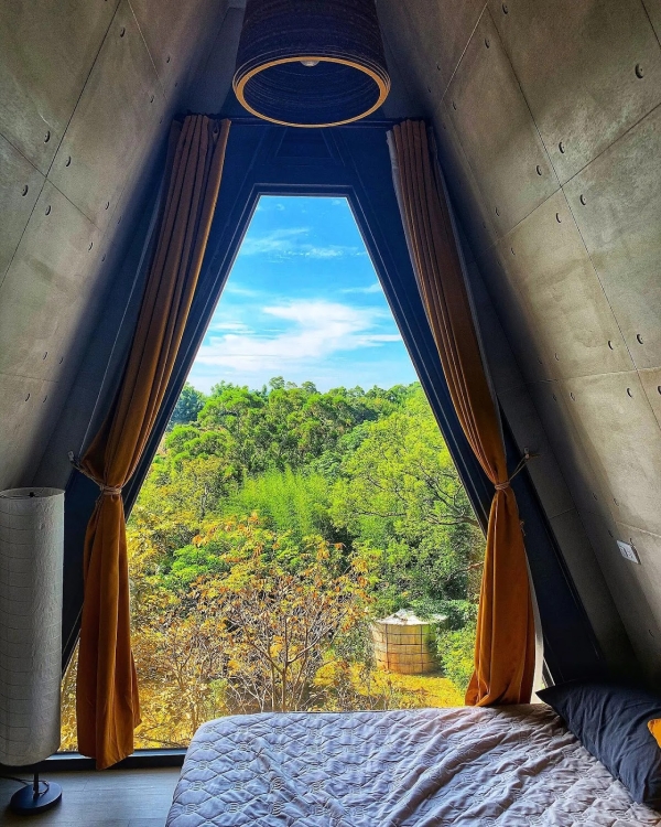 房間有片三角玻璃窗,拉開窗簾即是蔥鬱林,躺著就能擁抱4000坪田園山林美景,加上為寵物友善民宿,讓你可以帶著毛小孩一起出遊,享受一趟放鬆之旅!