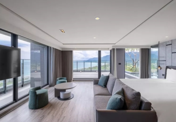每間臥室擁有遼闊的窗景及自然柔和採光,各自獨立且保有隱私。開放式的明亮客廳,搭配窗外隨著時間轉換的山海風情,使來住宿的旅客感到十分愜意。