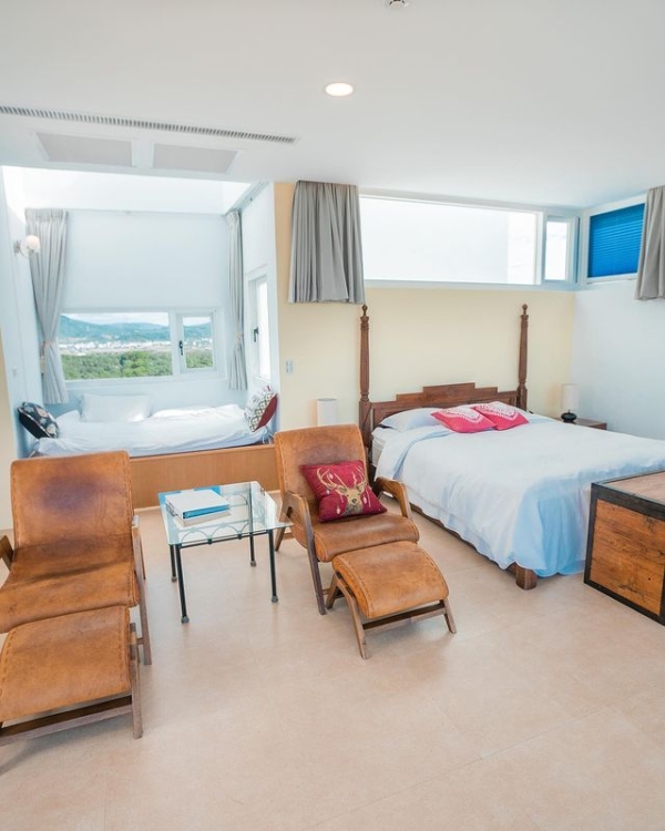 典雅、柔和的房內設計,讓住宿的旅客感受到放鬆;不僅如此房間內供舒適沙發有單人及懶人躺臥式。可以慵懶的觀賞窗外的三面環景。