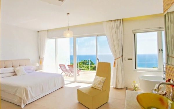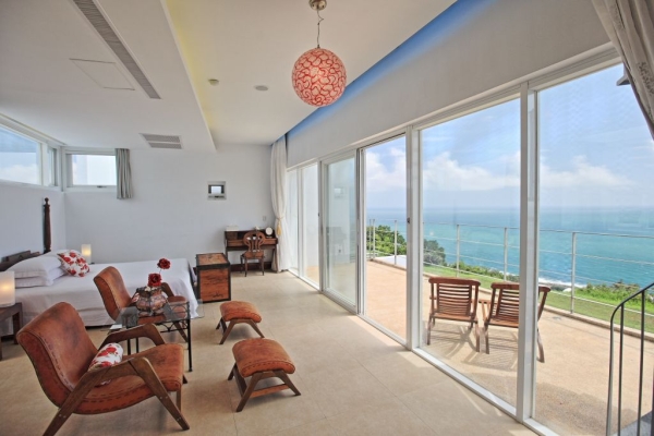海境渡假民宿位於墾丁小山頭,擁有大片綠地,每個房間都擁有一整面牆的落地窗以及一塊與觀景大露台,可以邊泡澡或在躺椅欣賞,在房間即擁有如此的美景,讓住在這裡的朋友可以享有自己的私人天地。