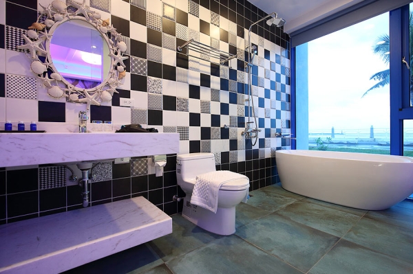 房內擁有乾溼分離的衛浴,附有可觀賞窗外景色的獨立浴缸,可以邊泡澡邊欣賞海天一色,超享受!