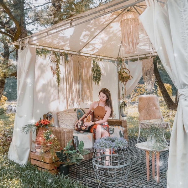 還有超夢幻波希米亞風的沙發裝飾區,在這用植物及小盆栽點綴了白帳的空間,非常好拍!