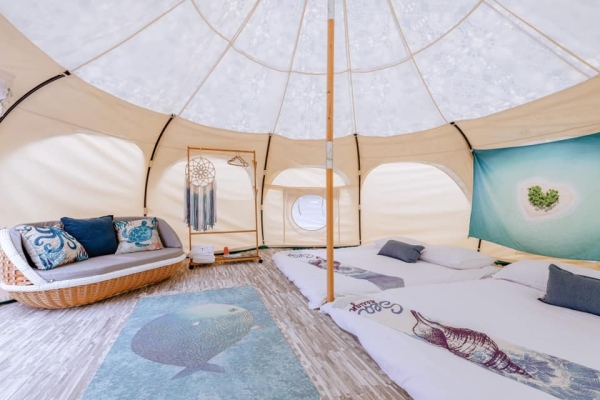 踏浪星辰露營Camp最特別的便是水漾森林系列帳篷,外觀看著就像是木屋一樣,但一進去便能看見慵懶的吊椅及浪漫的藤蔓帳篷~