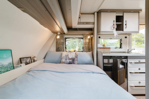 如果不想住帳篷,踏浪星辰也有露營車系列可以供旅客挑選!車內裝修以白色系為主,舒適寬敞還有冷氣,車外還有一個專屬木棧台,提供旅客休息,衛浴設備在外面!