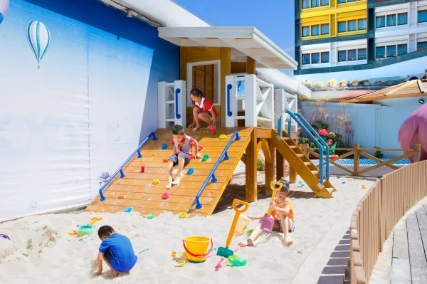 還有小孩最愛的沙坑區,採用柬埔寨進口細沙,觸感有點像動力沙,不會黏手黏在身體上,踩在腳上也不會痛哦!