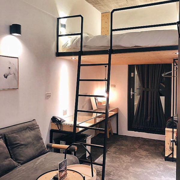 樓中樓房型不僅能帶來宿舍的親切感,房內木質搭配金屬的傢具卻不失優雅,小陽台搭配半室外衛浴間,隔絕濕氣的同時,也能達到睡眠與如廁的獨立空間。