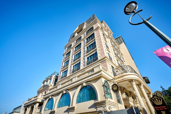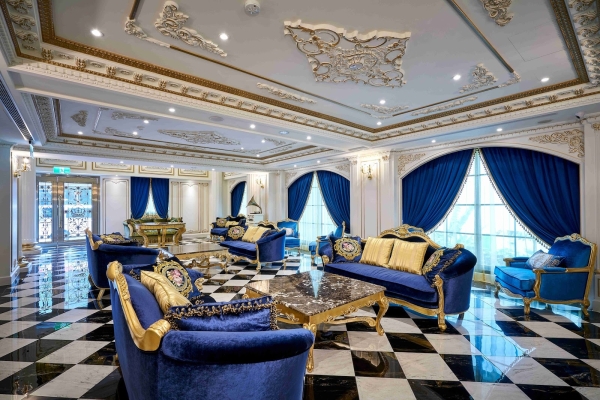 最受歡迎的打卡點便是皇后古堡飯店裡的餐廳,藍色絲綢緞面的沙發搭上歐式棋盤格磚,整個好拍到不行~