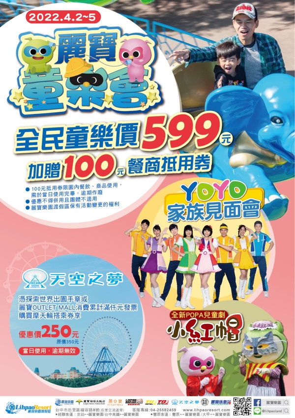 台中麗寶樂園渡假園區推出連假門票優惠活動,全民童樂價只要599元,還加贈100元餐飲商品抵用券,這期間憑探索世界出園手章搭乘天空之夢摩天輪還可享優惠價250元!