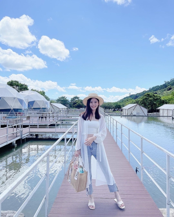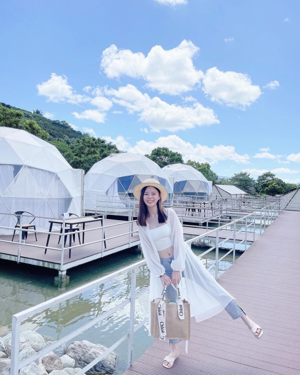 花蓮鯉魚潭露營渡假村 - 山水谷豪華露營區,是全台最大的合法露營區,最大亮點便是全台灣首座,真正的水上豪華露營球帳篷,有小型的水上球屋,外觀是淺藍搭配純白色調呈現出夢幻外觀造型~