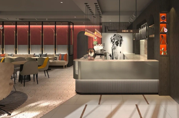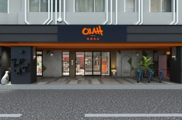 悅樂旅店外觀主體建築是灰白色幾何線條搭配橘色來作點綴,跟他們的招牌非常配,在旅店設計上也處處可見狗狗與長頸鹿元素,超可愛~