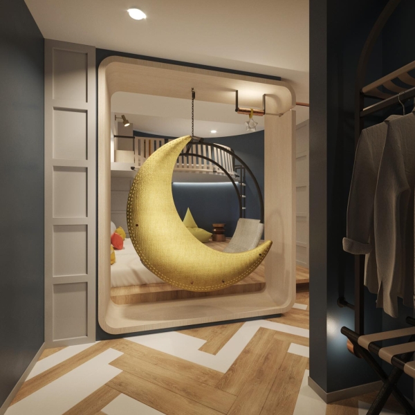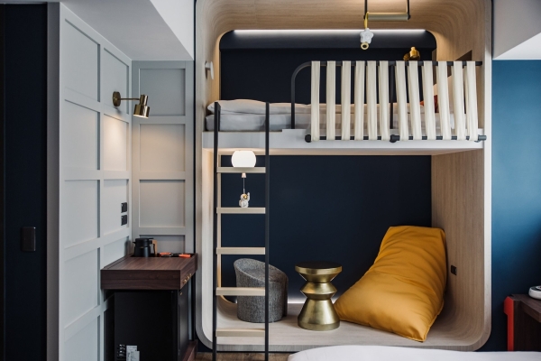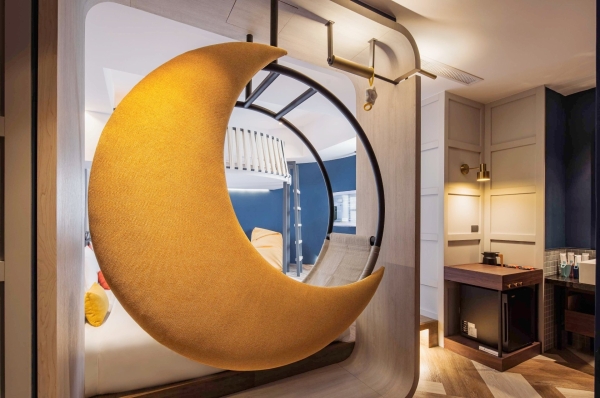 歡樂四人房,除了配有四個單人床外,還特別設計有小隔樓以及超吸睛的月亮造型躺椅,搭配繽紛配色超好拍~