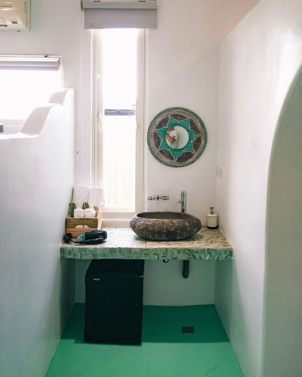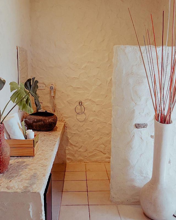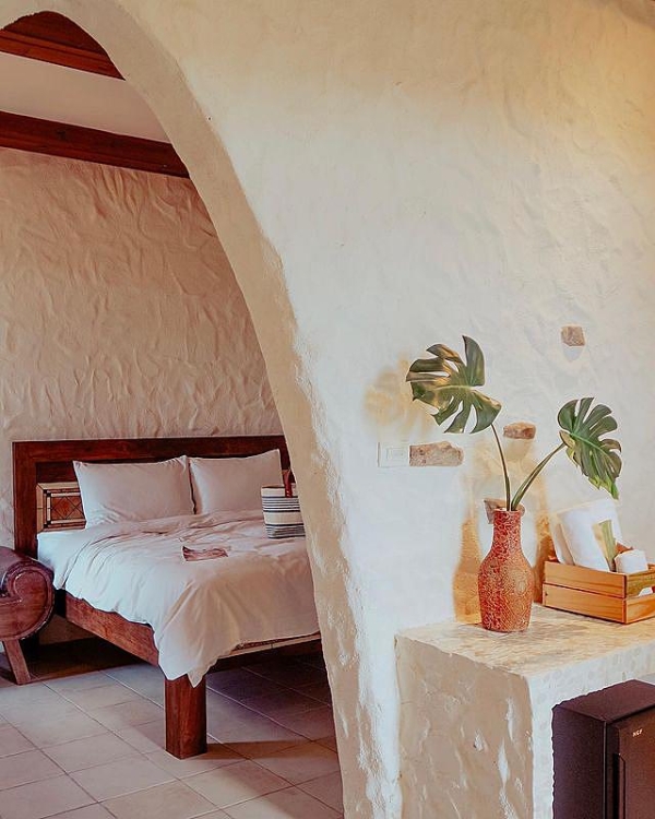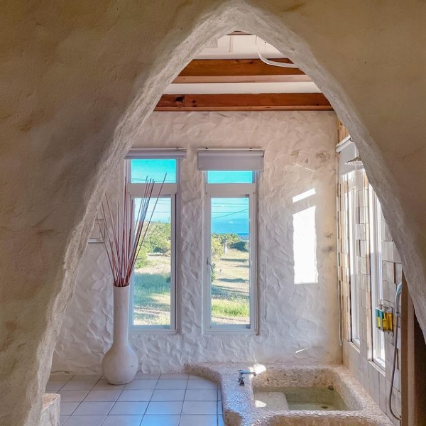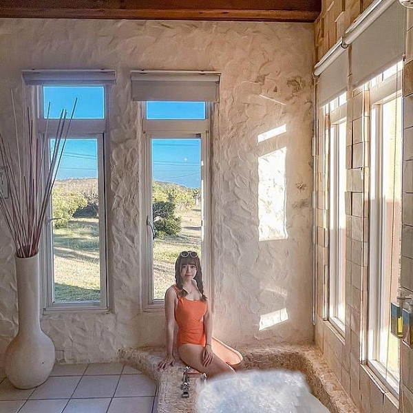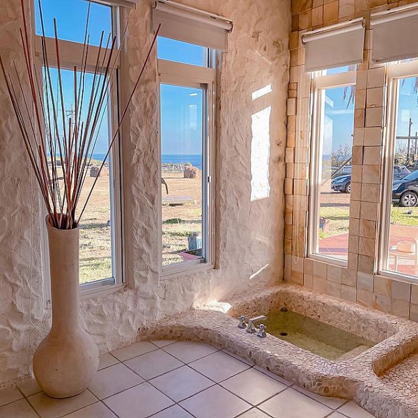 房內的洞窟設計,讓人感覺擁有格外的神祕感,開放式浴池,讓旅客邊泡澡的同時,還能觀看外面的寬闊綠意的大草原,以及一望無際的海洋,療癒感十足!