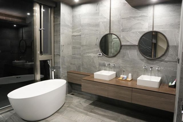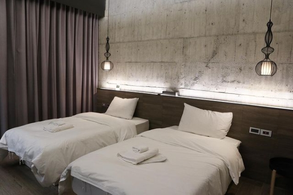 房內的設計採清水模牆面與工業風裝潢,梳妝區和浴室用拉門隔間增加延伸視覺感,讓人進入房間內,是感覺舒適快活的!
