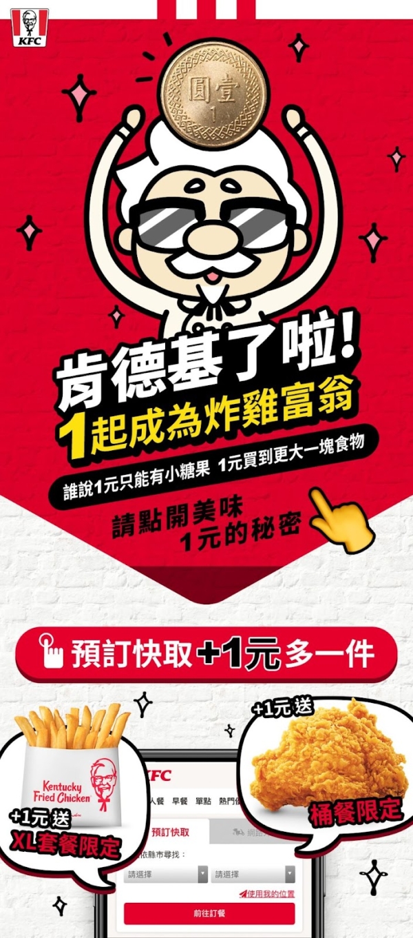 肯德基加一元多一件活動開跑啦,炸雞、薯條通通有!清明連假期間肯德基推出預訂快取的優惠,即日起只要使用肯德基預訂快取服務,買XL套餐就可以一元加購香酥脆薯,買桶餐則是可以一元加購咔啦脆雞。