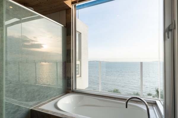 一邊泡澡一邊看著窗外海景,蔚藍的海潔白的建築,就像身處在希臘一樣。
