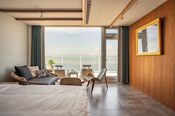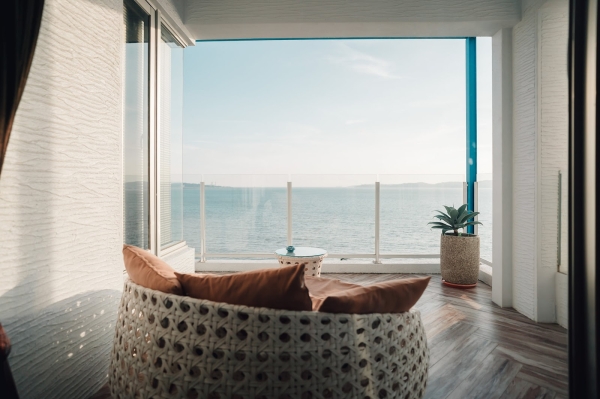 金門「海院子」有著不規則的白色建築外觀十分醒目,每一間房間都擁有絕美海景,夕陽西下時走到陽台吹著徐徐海風,平時的壓力都會瞬間消失!