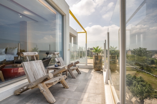 可在陽台上具有獨特風味的木頭桌椅上泡茶聊天,享受悠閒時光。