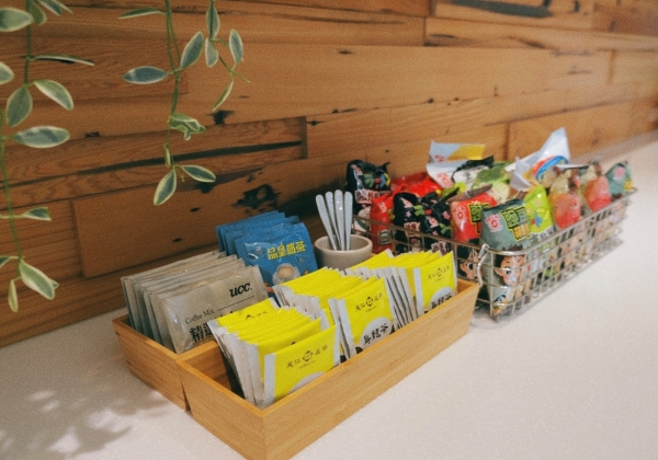 旅店也貼心的附上一些茶包和零食,讓旅客們自行享用!