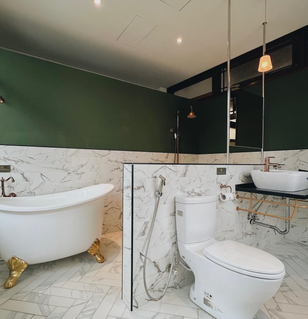 沐浴空間使用了大理石花紋搭配墨綠色系的牆景,營造出高貴優雅的感覺,泡個泡泡浴最適合不過了!