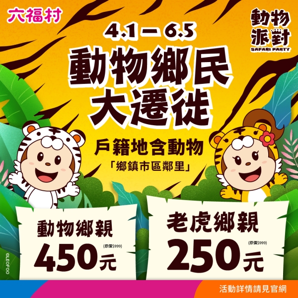 六福村推出「動物鄉親&老虎鄉親」活動,即日起至6/5的假日,只要於六福村現場購票,戶籍地「鄉鎮市區鄰里」內任一字,含動物名享優惠價450元、含「虎」字享優惠價250元!