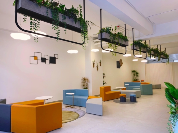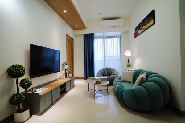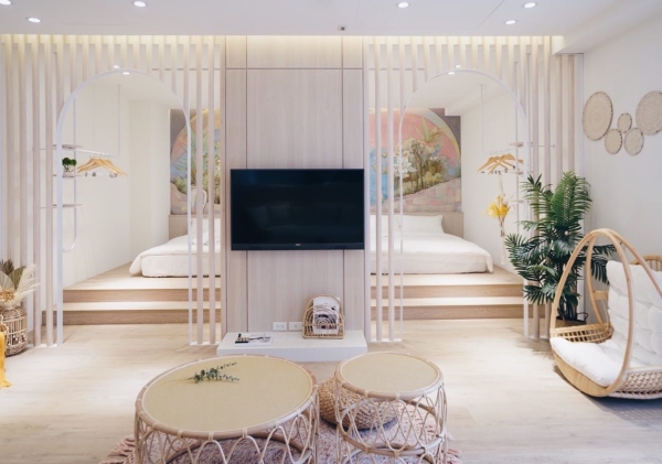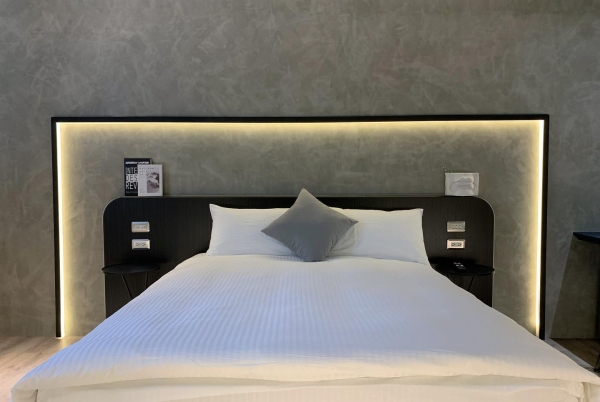 第一間摩登時尚風格房型在小客廳裡擺放了兩張醒目的燈心絨布沙發和時尚感家飾,讓整個空間裡充滿了摩登和時尚風格,房間部分是以簡單舒適為主的色系和家飾去做搭配,視覺上看起來很舒服!