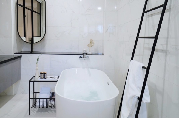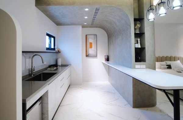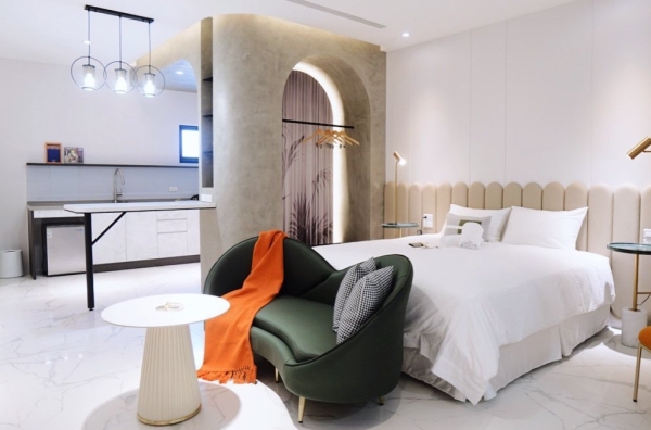第二間現代輕奢風格房型裡的衣櫃部分設計了特別的「拱門」造型,在搭配上現代風格家飾,更顯現出房間裡的輕奢風格,屋內還有簡易的廚房和小吧台,設備有電磁爐 、小平底鍋、餐具都很完全,衛浴空間也很大還有個大浴缸,玩累時還可泡澡紓解疲憊感!