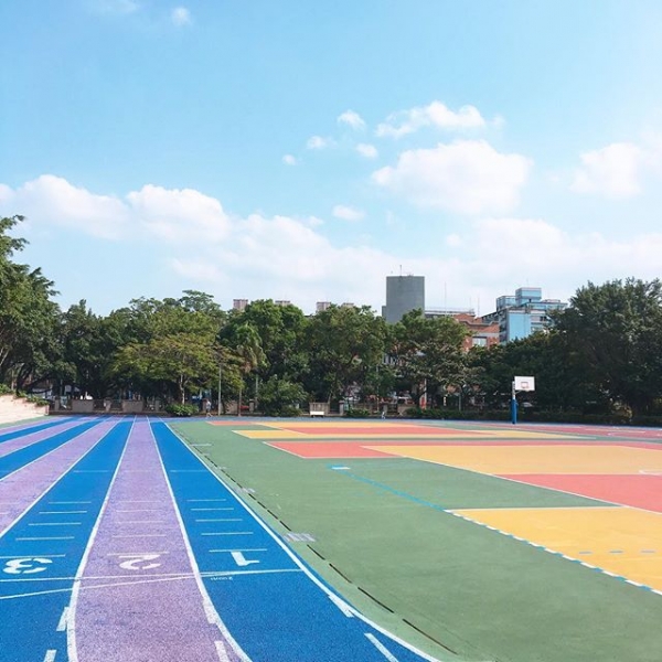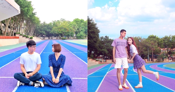 新北市板橋區沙崙國小推崇從生活中落實美感,將操場採用大膽的藍、紫色跑道,開放後一舉成為超夯打卡熱點~剛好今年流行紫色、配上最屬於夏天的藍色,拍起來好可愛、好適合現在這個初夏呀!