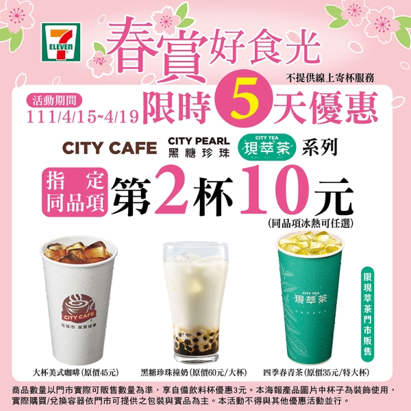 最後7-11優惠也同步祭出!即日起至4/19,推出「春賞好食光」活動,至門市購買3大咖啡飲品指定同品項可享「第2杯10元」,品項為CITY CAFE大杯美式咖啡、CITY PEARL大杯黑糖珍珠撞奶、CITY TEA特大杯現萃茶四季春青茶,冰熱可任選,不提供線上寄杯。