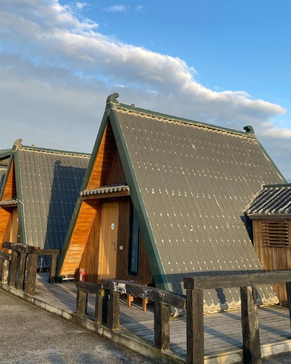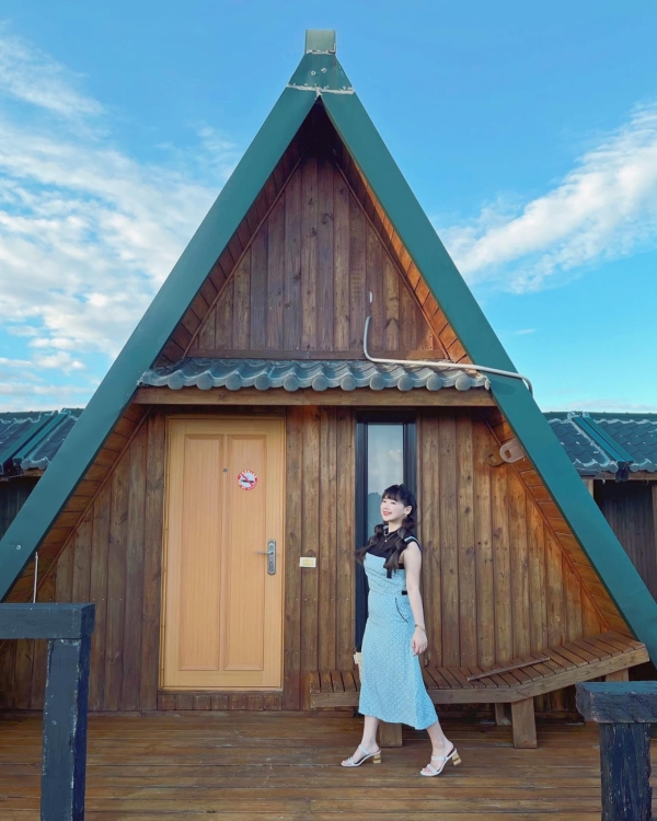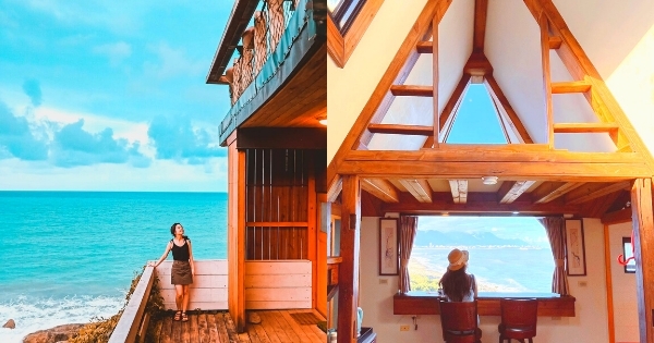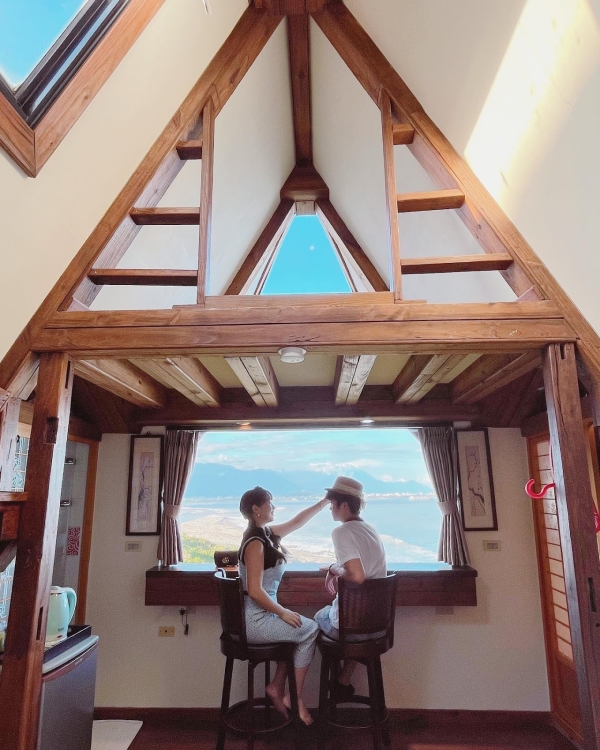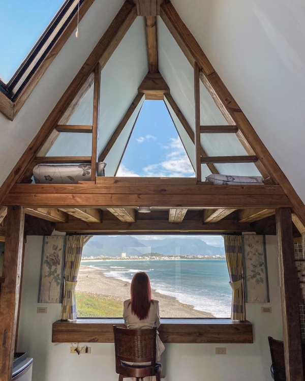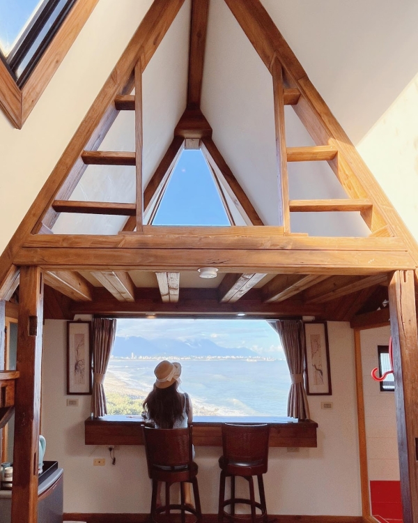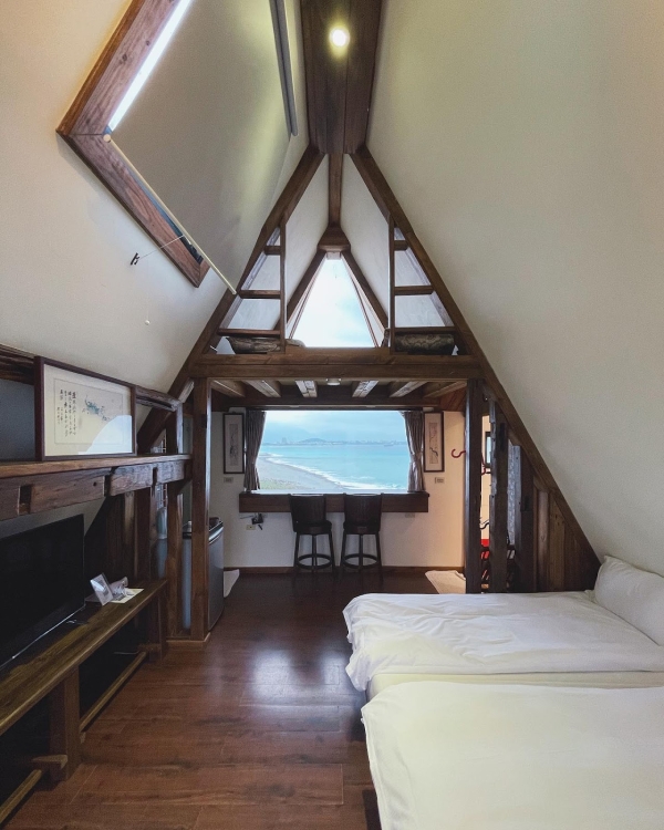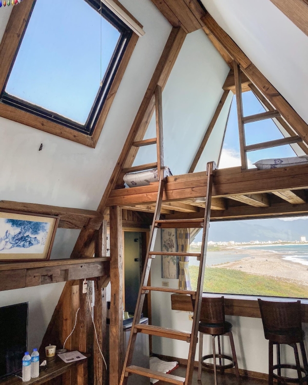 建築外觀是以木材所建造的,屋頂部分設計是特別的三角形型狀,就像日本的白川鄉一樣夢幻可愛,房間裡有兩面都是可以眺望遠方蔚藍大海的窗戶,一起來的小情侶們可以望著窗外坐在高腳椅上,拍照起來超級可愛,房間裡還有一個神祕小閣樓,走上木製樓梯就能看見另一面海景窗了,待在裡面望著窗外發呆很是幸福,不去想著生活上所有的麻煩事,放下一切輕鬆的渡過一個美好假期!