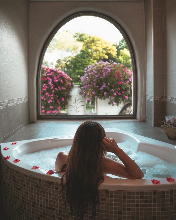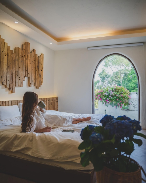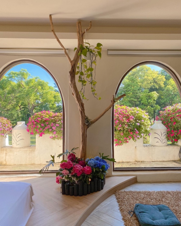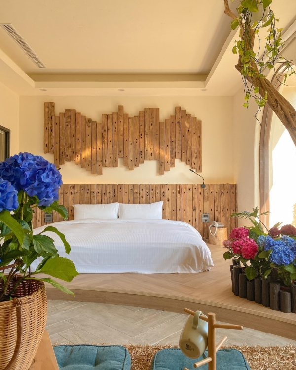 房間用了暖色調的木材和色彩繽紛的繡球花所設計而成,視覺上充滿了溫馨感,就像是住在小花園裡一樣夢幻!衛浴空間裡還有扇浪漫弧形窗,可以一邊泡著浪漫泡泡浴一邊欣賞窗外美景~