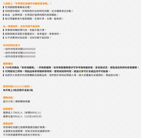 除了有露營烤肉區外,還有全台唯一「不限時」燒烤、泰國蝦、熱炒火鍋吃到飽,啤酒無限暢飲,不喝酒的也有多種飲料可以現點現調,當季最新鮮的水果現打成果汁,共有80多種新鮮食材,現點、現烤,更有專業烤台師傅幫你服務!