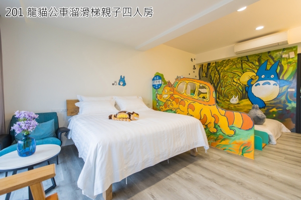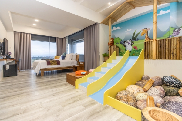 民宿裡有多種親子房型可選擇,每間房都專屬的溜滑梯和球池,而且每個主題都不同,像有很多可愛動物的「森林樹屋房」,旁邊還有溜滑梯跟超像石頭的枕頭山,讓小朋友玩樂同時也能有保護的作用,爸媽也安心!