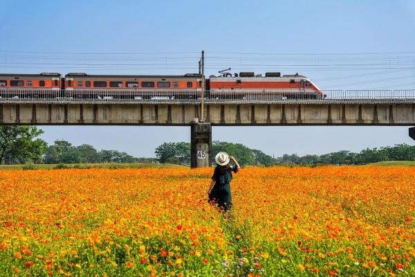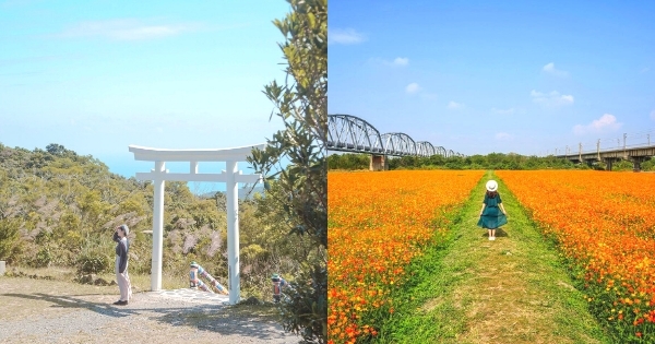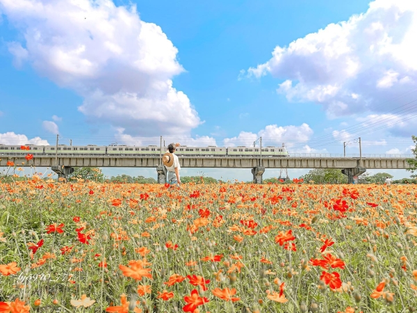 屏東下淡水溪鐵橋裡的「波斯菊」大爆發了,盛開的程度就像是一整片的黃色海岸,剛好旁邊的列車呼嘯而過著,搭配上藍天白雲,視覺上看起來超浪漫,每當列車經過同時按下快門後的照片,堪稱大師級所作啊!久而久之就變成了隱藏版的夢幻打卡景點,同時也吸引許多攝影愛好者和網美們前來欣賞拍攝。