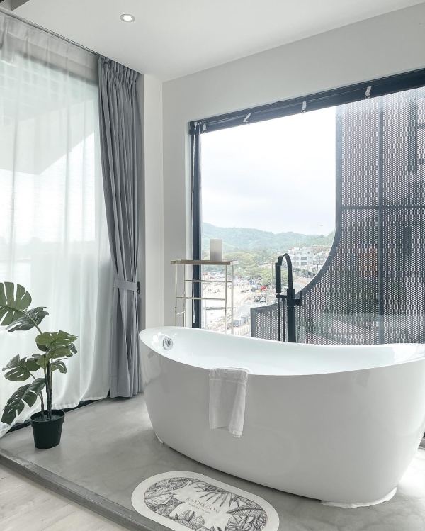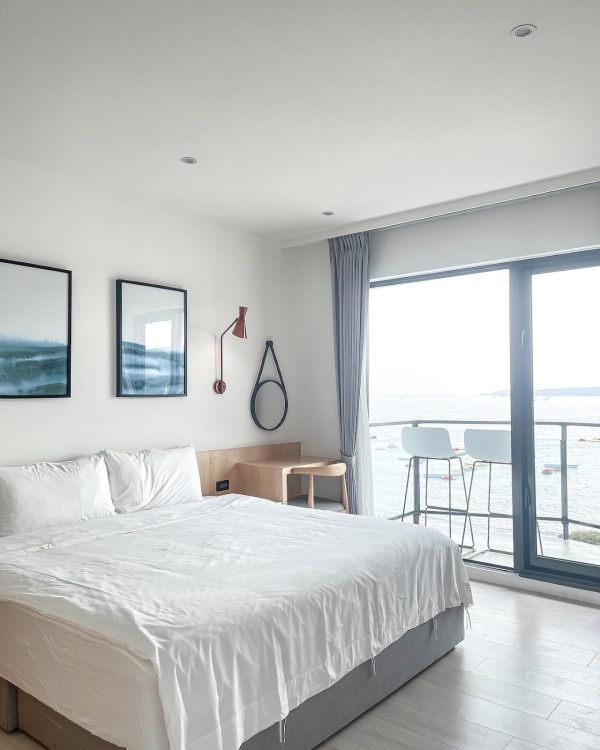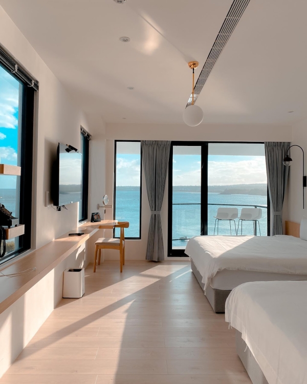 房間內風格簡單乾淨在搭配上暖色木材看起來溫馨感滿滿,還有這片不管是大人小孩都會為之瘋狂的大落地窗,外面有無敵海景小陽台,可以坐在高腳椅上吹著涼風欣賞蔚藍大海或超美星空,拍出來的照片像極了出國渡假的氛圍。衛浴空間裡的浴缸也很大,能邊泡澡邊看海超放鬆療癒~