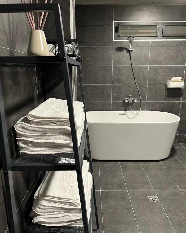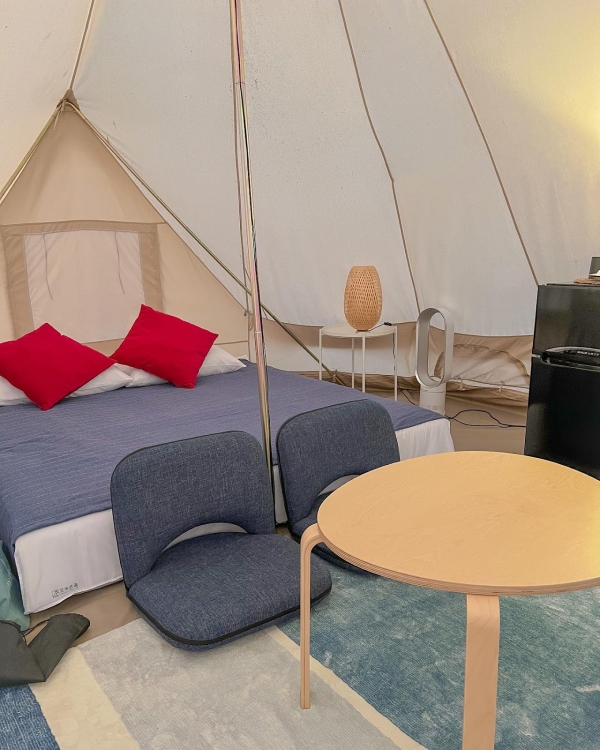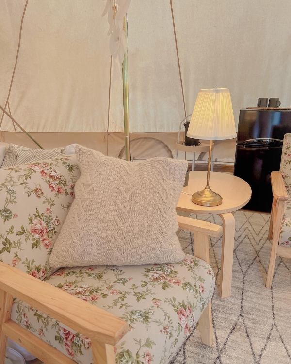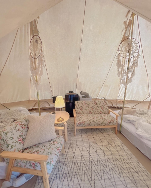 「波希米亞風格」帳篷裡的設計很夢幻可愛,擺放了兩張超有氣氛的古典花紋木把手小沙發和掛在支架上的純白補夢網,能讓入住的旅客們都有個好夢,整體看上去充滿了浪漫的氛圍感!衛浴空間設計風格為北歐風,裡面打掃的很乾淨而且還有浴缸可以泡!