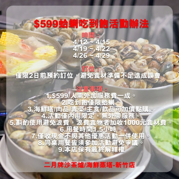 本次舉辦期間限定「蛤蜊吃到飽」活動,目的是希望將新鮮味美的真材實料分享給更多的顧客,所以凡於期間內訂位成功,都可以享有$599蛤蜊吃到飽的權利!用餐時間1.5小時,服務費、青菜、肉品、酒水另計,不與其他優惠一起使用,僅提供內用無外帶。