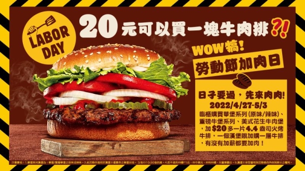 漢堡王為了犒賞上班辛苦的勞工們,所以在勞動節前夕推出了「20元很有用!20元可以買一塊牛排!」優惠方案,從「4月27日~5月3日」到臨櫃購買這四款華堡系列漢堡「華堡、雙層華堡、重磅牛堡、美式花生牛肉堡」,加20元就可加一層4.4盎司牛肉排!