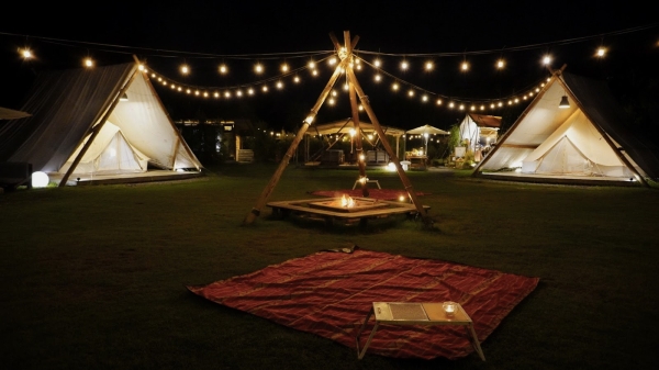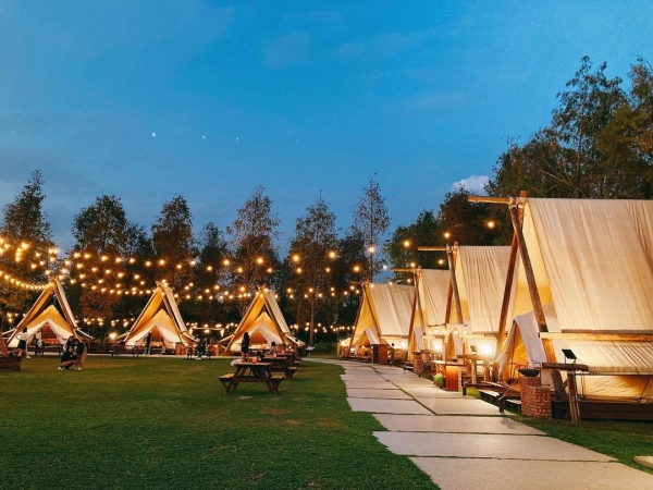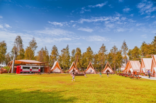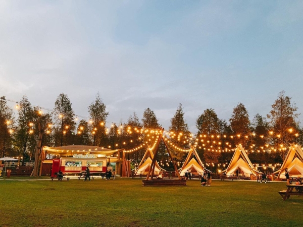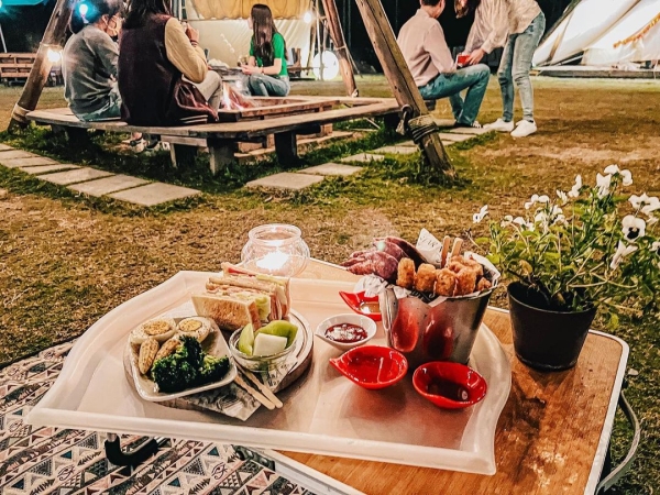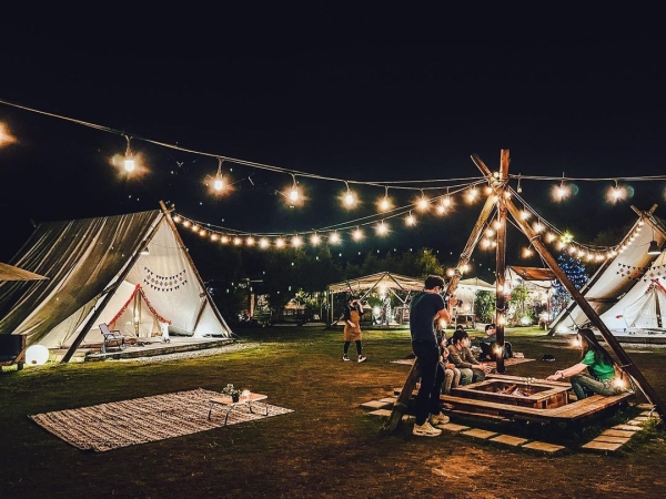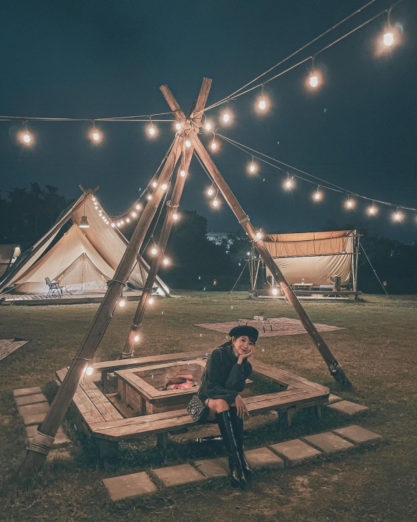 戶外空間還有一區大營火,可以和親朋好友們圍著營火,肩併著肩坐在一起取暖談天說地、享受駐唱歌手美妙的音樂,還能一邊烤爆米花和棉花糖,每月也都有市集可以逛,白天藍天綠地怎麼拍都美,到了晚上燈火通明又是不一樣的浪漫,來到這裡讓你一次享受露營野餐的樂趣!
