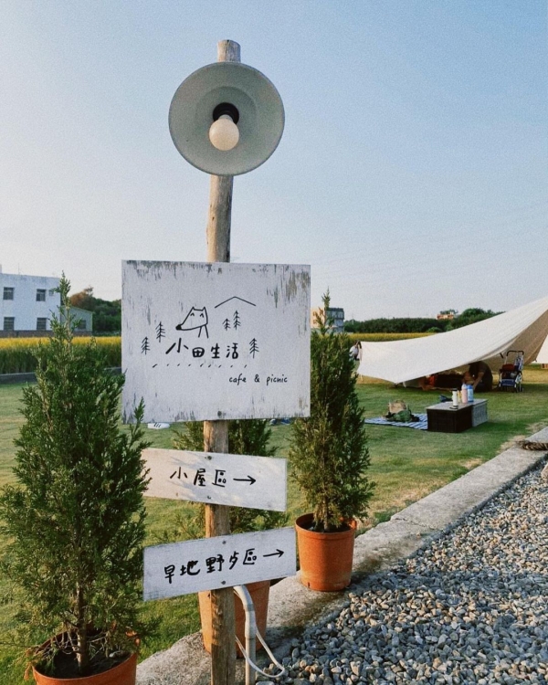 「小田生活mmm」位在彰化田尾,座落在金黃稻田中,日系文青風的簡約設計,戶外有一大片綠油油的草皮,還有野餐區可以來這體驗戶外野餐,也有美式帳篷造景可以打卡拍照!來這裡可以遠離塵囂、體驗鄉間慢活,悠閒地喝喝下午茶~提醒!小田生活僅提供野餐桌,「 野餐墊 」請自備,若有毛小孩需牽繩唷!
