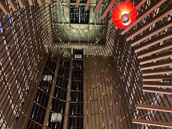 一走進大廳就被頭頂上超壯觀的「48米挑高魚簍天井裝置藝術」給深深吸引,這個「魚簍天井」使用了鋁合金結構所製成總共有12層,魚簍的口徑小容量空間大,就像是錢財只進不出的旺財寓意,同時也向著安平過去的漁村致敬。