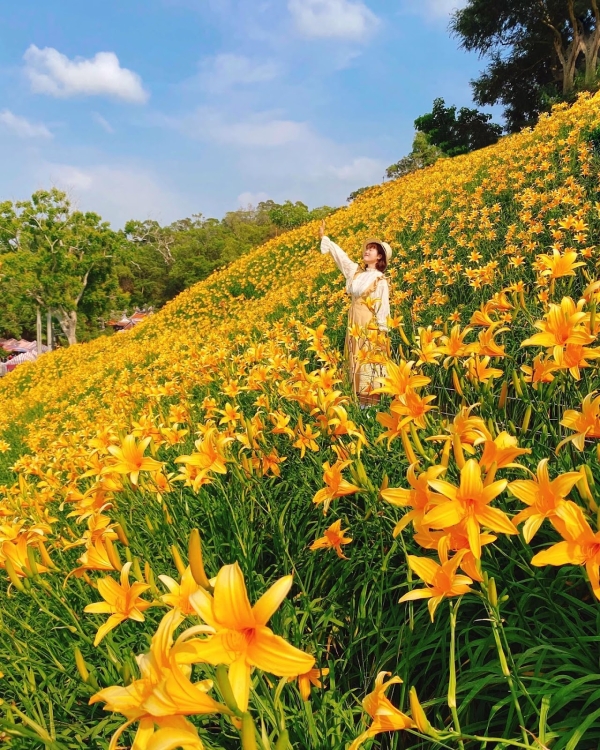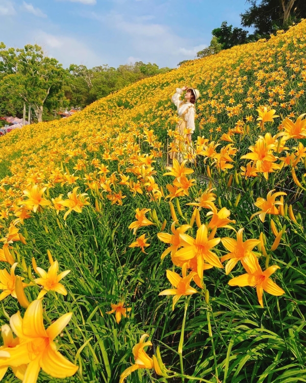 彰化擁有平地最美金針花海美名的「花壇虎山巖金針花」來喽,每年4、5月虎山巖都會變成一座金色山丘,沿著階梯慢慢走上去就可以抵達這片超美金針花海裡,在裡面最要注意的就是各位的手機、相機記憶體,因為這片黃金花海一定是最美的記憶體殺手!