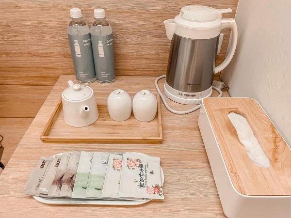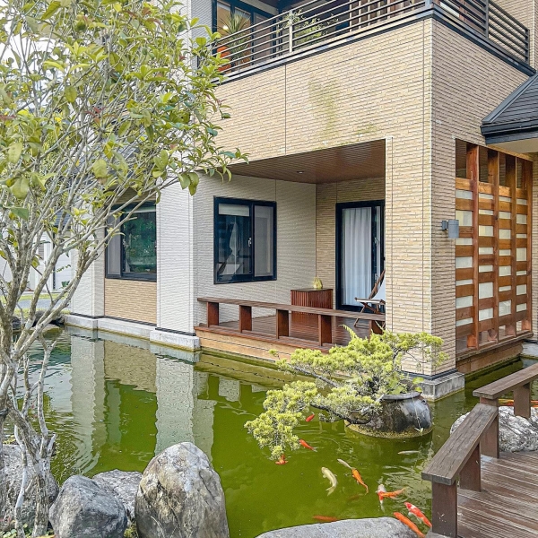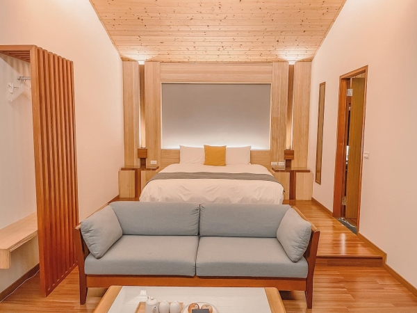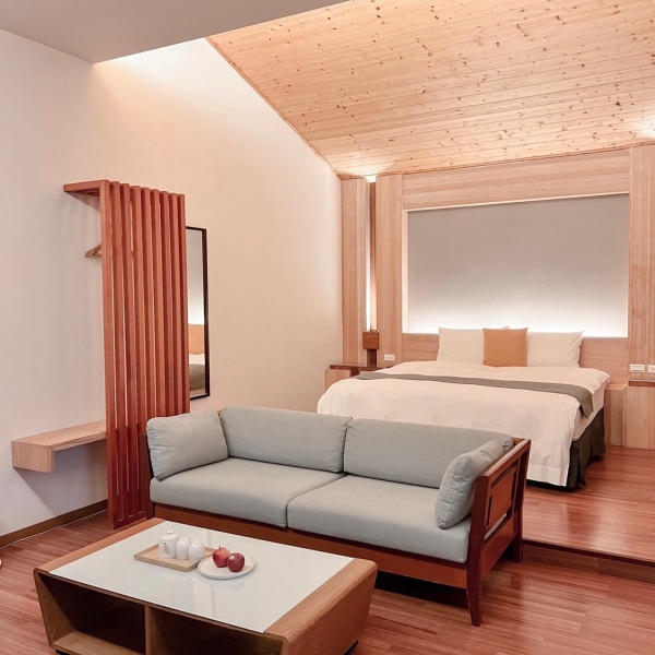 民宿房間分為兩棟,有「左廂」和「右廂」為選擇,在右廂的雙人湖景房陽台旁有個鯉魚池,能欣賞鯉魚們在池裡暢游著也能餵食它們!房間裡風格多以木材為設計,充滿著簡約舒適氛圍,在視覺上讓人有種回到家的溫馨感。