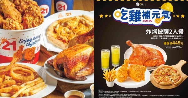 51勞動節吃雞補元氣,體恤在職場奮鬥的夥伴們,21世紀推出3款雞肉料理「招牌烤雞、酥脆炸雞、濃郁起司雞肉披薩」套餐優惠,從4月29號~5月2號「限時4天」,至門市出示以下圖片即可購買優惠套餐喔!