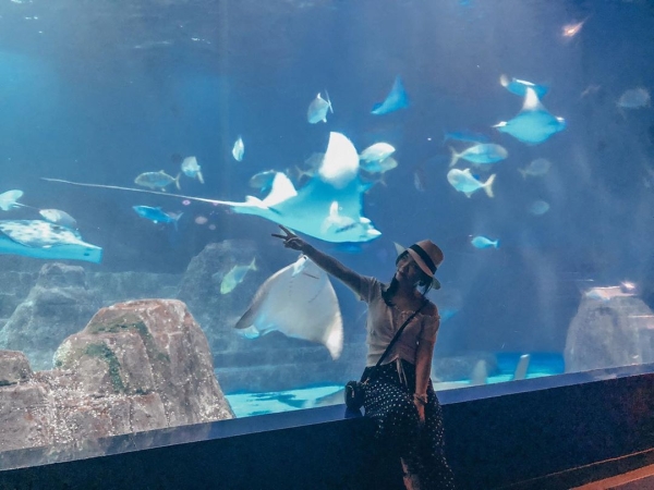海洋館裡有各式各樣的魚類,魟魚更是吸睛的一群,像鳥一樣的在水中翱翔,超療育的表情卻和牠外型相反,超可愛的啦!