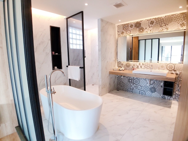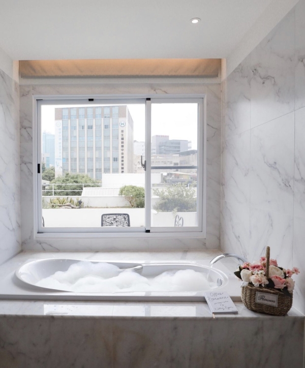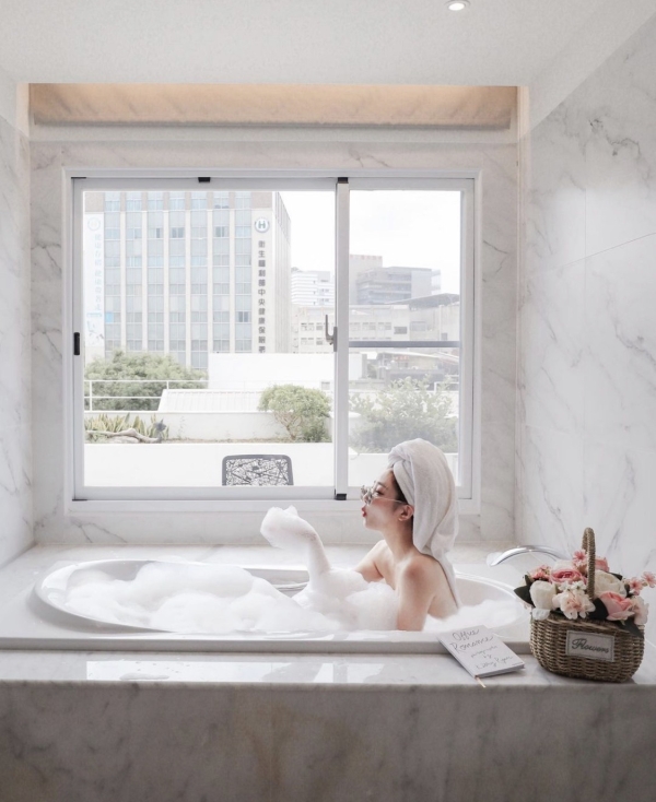 防窺探的透明玻璃窗,不用擔心外面看進來裡面!可以超享受泡泡浴,大理石牆面也很拍!邊泡澡還可以欣賞戶外的景致!